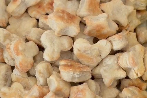 Nimm den Teig aus dem Kühlschrank und rolle ihn auf einer mit etwas Mehl bestäubten Arbeitsfläche aus. Steche mit beliebigen Ausstechern Kekse aus dem Teig aus. Die Kekse werden anschliessend während ca. 11 Minuten leicht goldbraun gebacken.